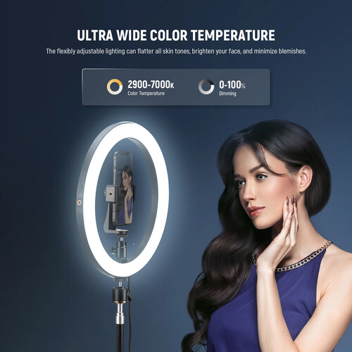 Illuminate your scenes with the RH12B Bi-Color LED Ring Light Kit from Neewer. This 12″ bi-color ring light includes a metal aluminum stand that extends to 71″ and a holder to place your smartphone in the middle of the ring. Add fill light to your videos with this bi-color light, which has an adjustable 2900-7000K color temperature, 180 LED beads, high CRI/TLCI ratings of 97 and 98, 0-100% variable brightness, and an output of 452 lux at 3.3′. You can control the ring light via onboard controls with a generous cable length of 76.7″. This kit also includes a bag for storage and transportation.
