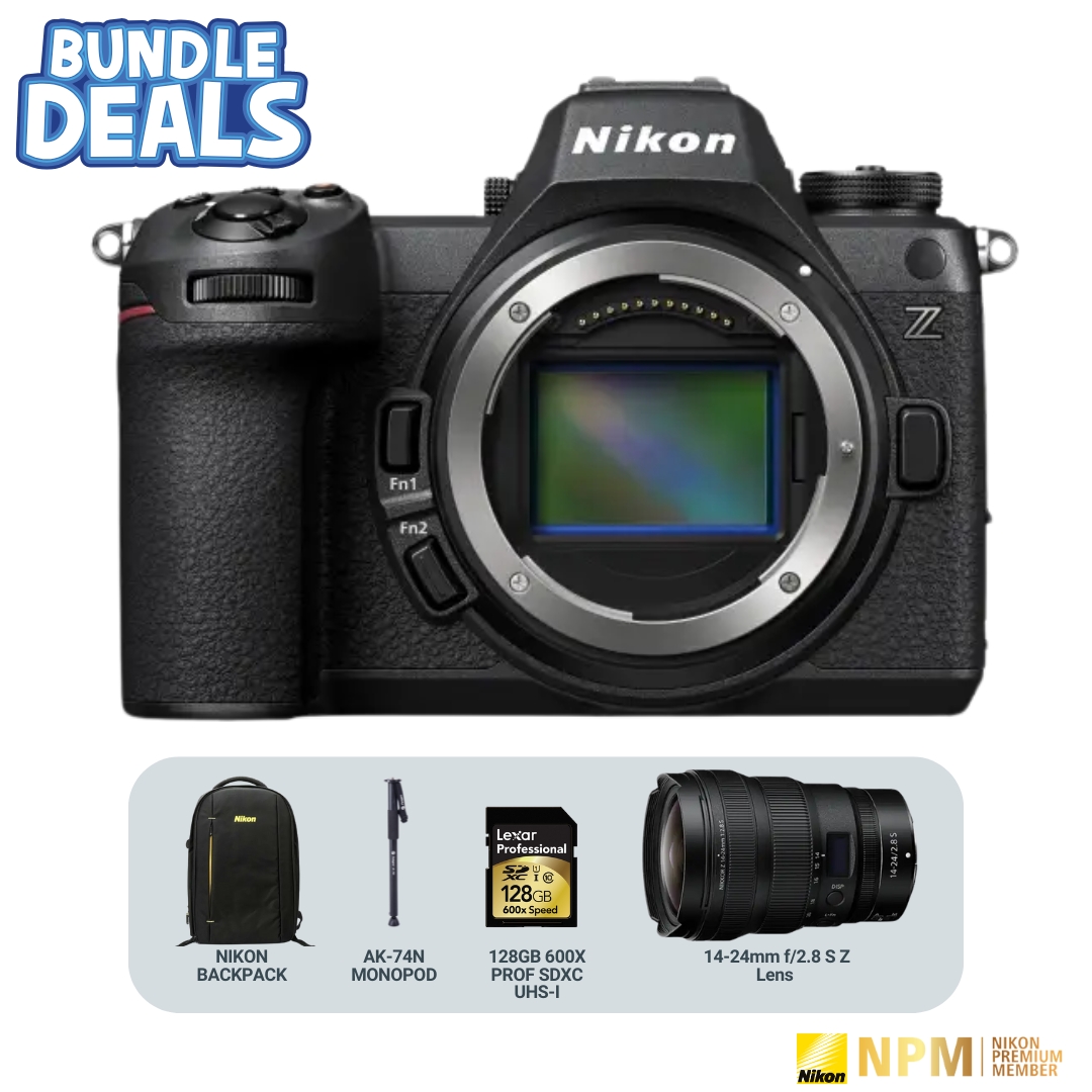 Bundle Includes: Nikon Z6 III Body | 14-24mm f/2.8 S Z Lens | AK-74N Monopod  |  Lexar 128GB 600X SDXC UHS-I (Class 10) Card  |  Nikon Backpack